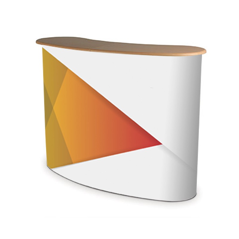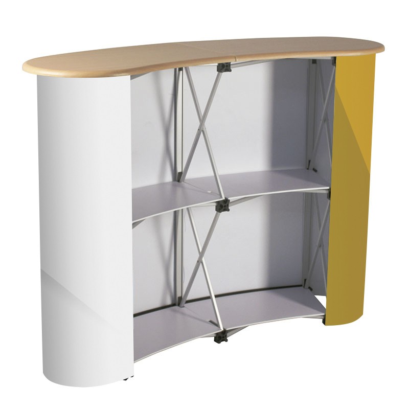 Mostrador curvo y plegable, siendo una excelente opción como punto de recepción o acreditación para los eventos. Es un producto que se pliega y se transporta cómodamente dentro de su bolsa de transporte con ruedas.